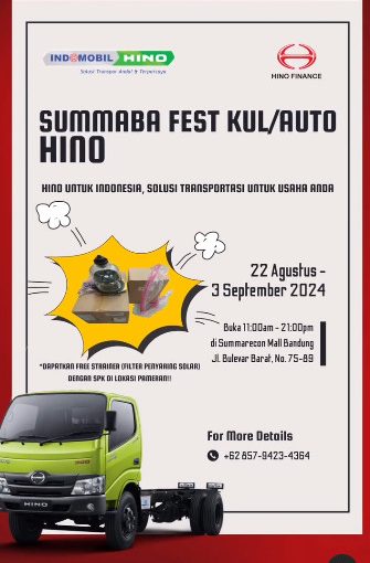 Summaba Fest Kul/Auto HINO September 1, 2024 Yuk join bersama Indosentosa Trada Hino segera dan dapatkan penawaran terbaik dari kami!